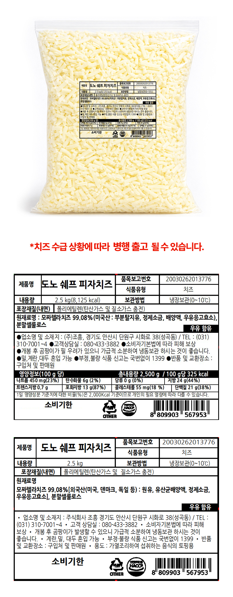 ♥첫구매♥도노쉐프 피자치즈(모짜렐라99% 2.5Kg) 냉장 이미지