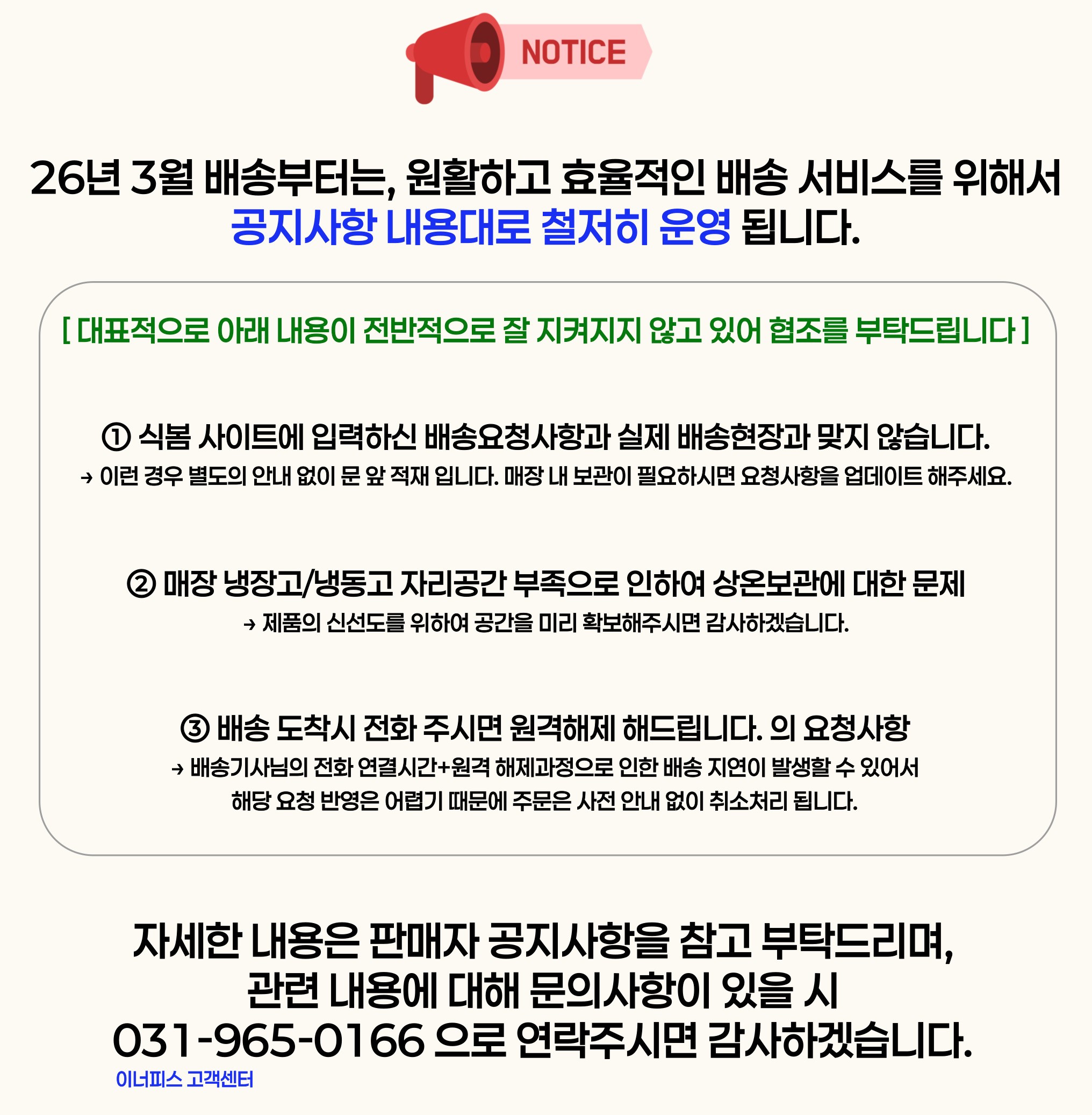 전자상거래 등에서의 소비자보호법에 관한 법률에 의거하여 미성년자가 체결한 계약은 법정대리인이 동의하지 않은 경우 본인 또는 법정대리인이 취소할 수 있습니다. 식봄에 등록된 판매상품과 상품의 내용은 판매자가 등록한 것으로 (주)마켓보로는 그 등록내용에 대하여 일체의 책임을 지지 않습니다.