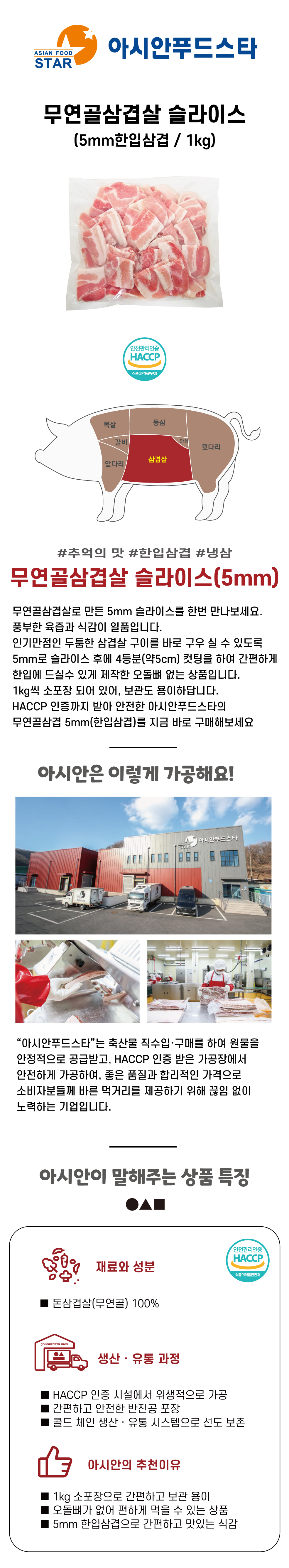 [싱싱배송] 무연골삼겹살(한입삼겹/5mm)(1kg/EA) 스페인산 소포장 두툼한 구이 배달삼겹 냉삼