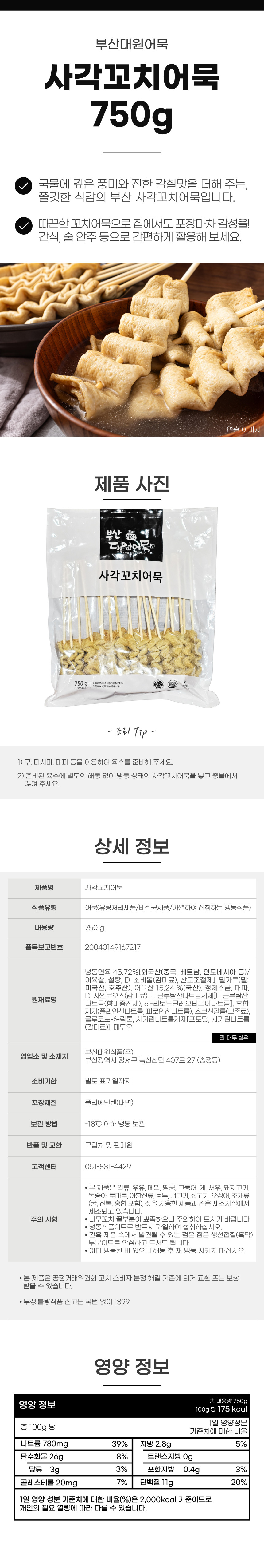 부산대원 사각 꼬치어묵 750g (30g*25개입,냉동) 부산어묵 꼬지어묵 오뎅