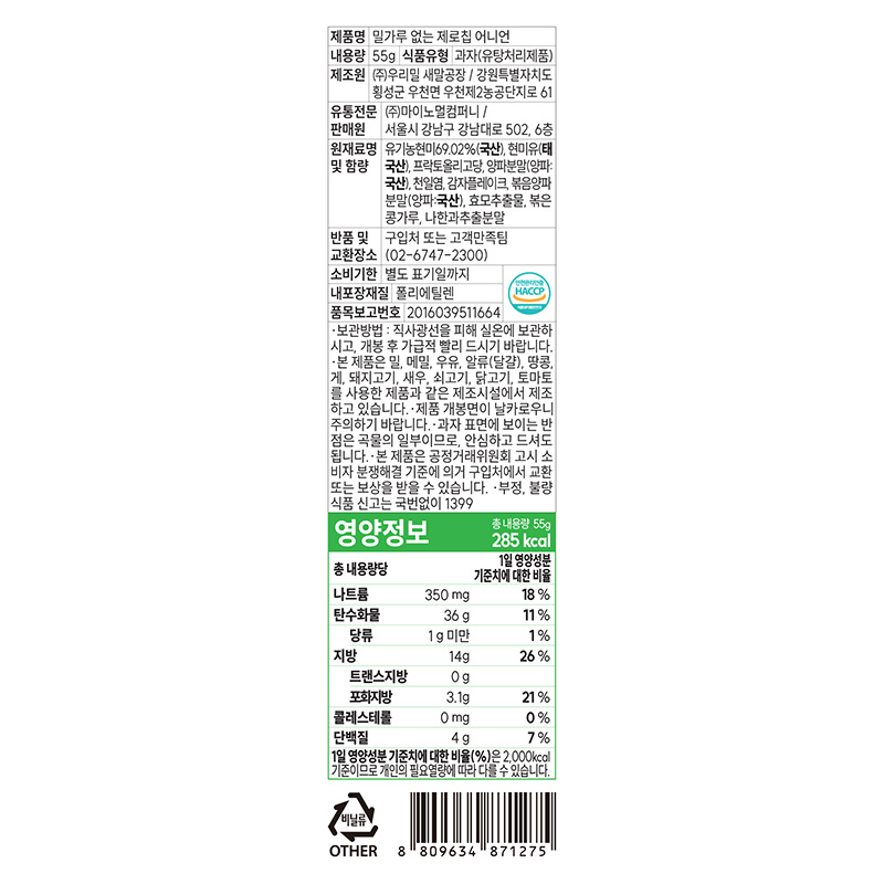 마이노멀 100%국산현미제로칩(어니언 55g/EA)