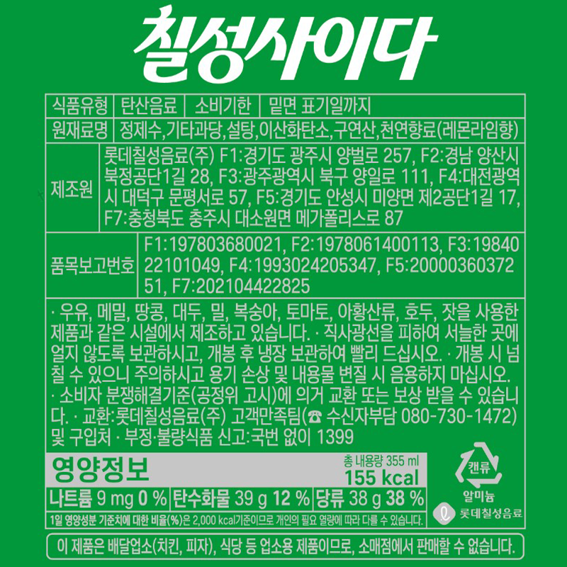 ♥첫구매♥칠성 사이다(업소용 355ml*24EA/BOX) 뚱캔 음료 이미지