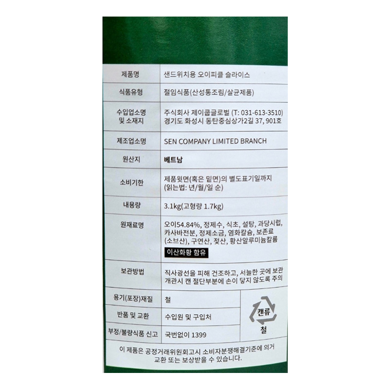 제이쿱글로벌 샌드위치피클(슬라이스 3.1Kg/EA)